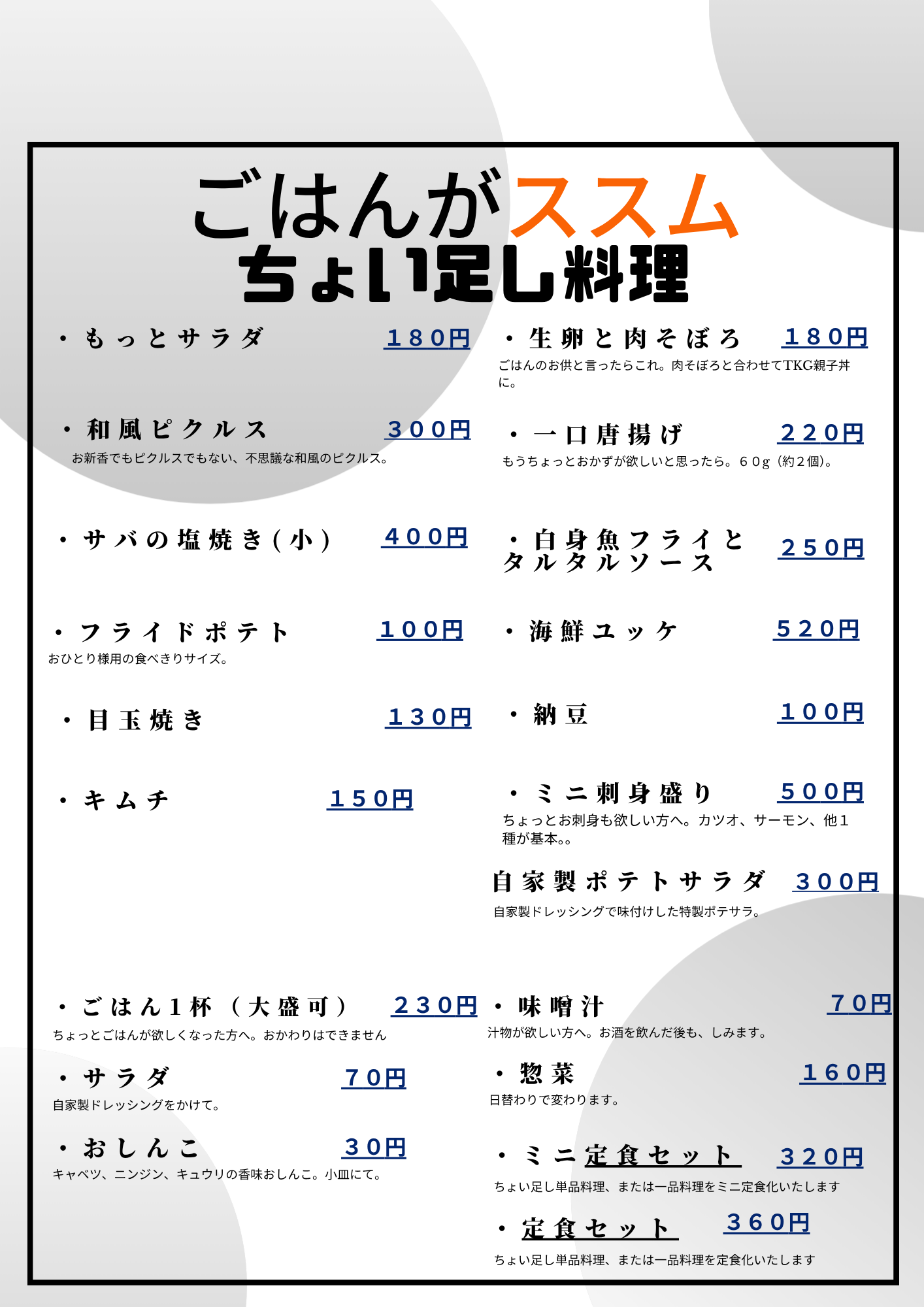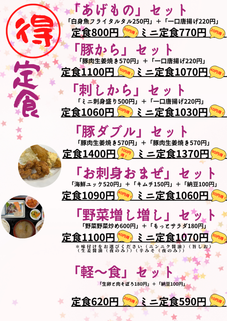 *すべての定食にサラダ、おしんこ、みそ汁、特製冷奴が付き、ごはんは大盛無料、+100円でお替り1杯(大盛可)となります。(価格は税込)