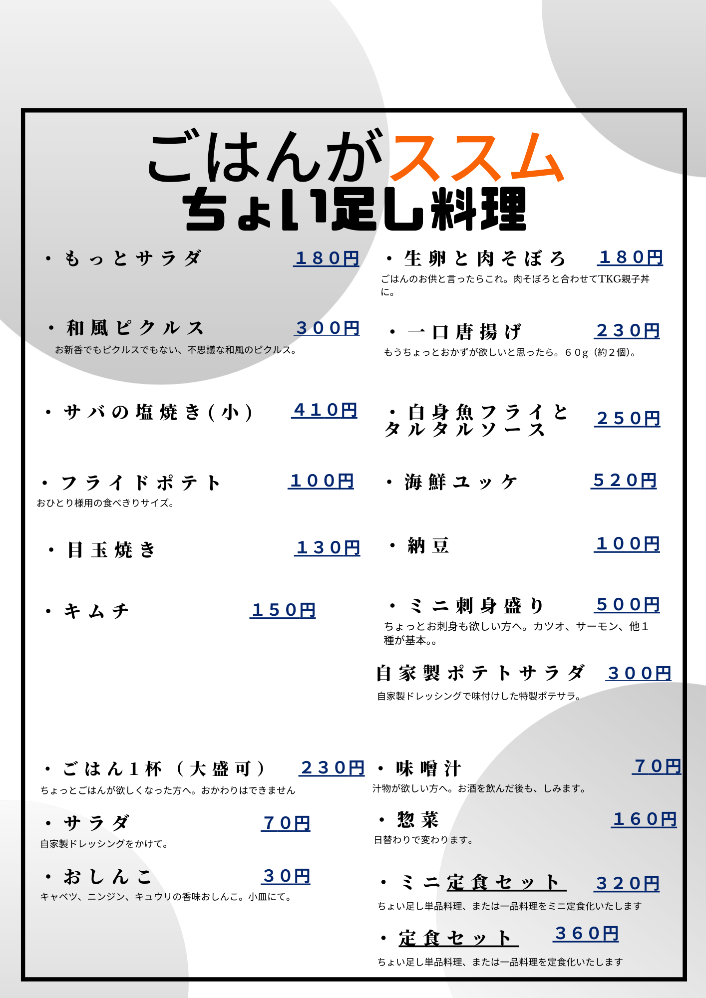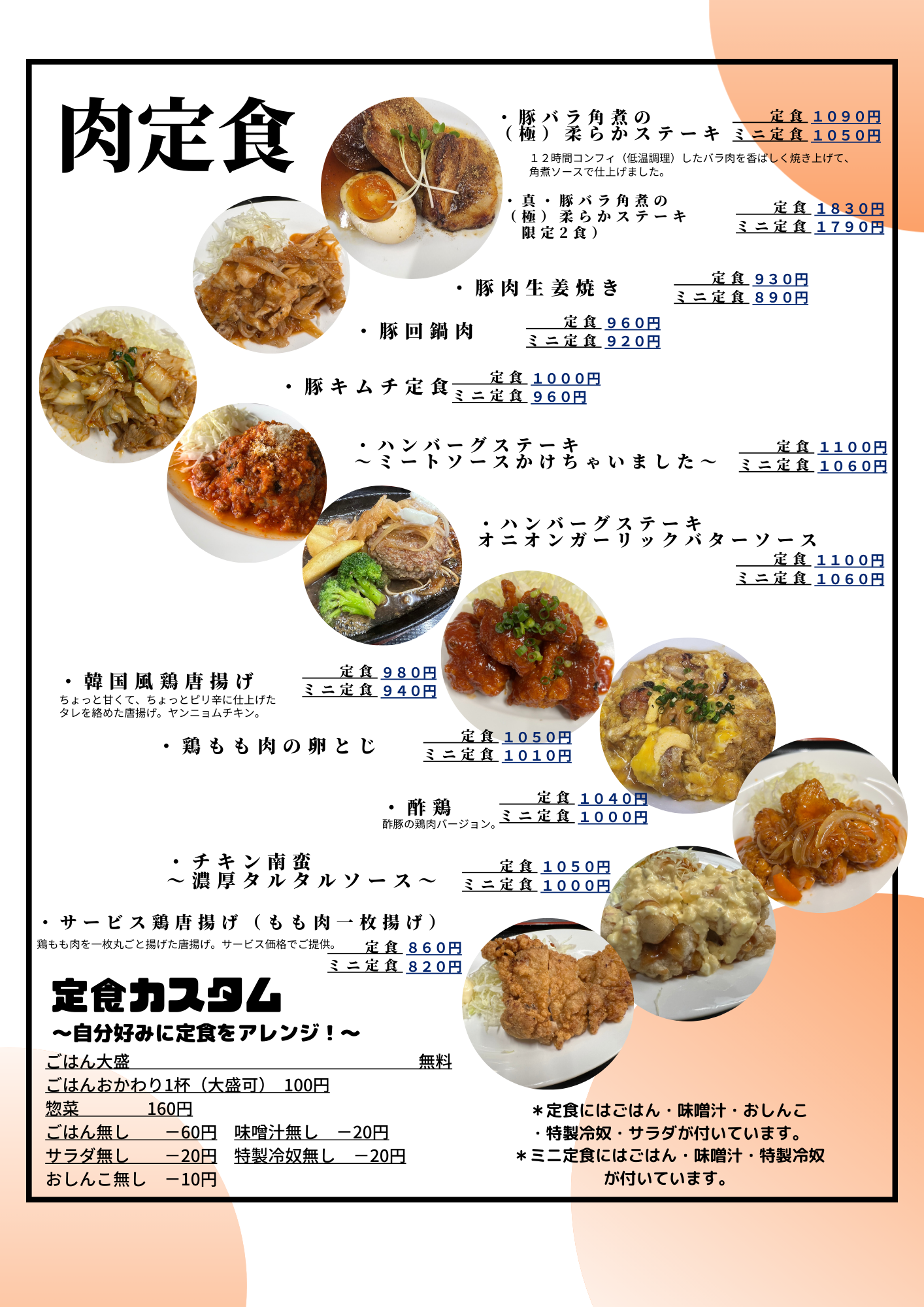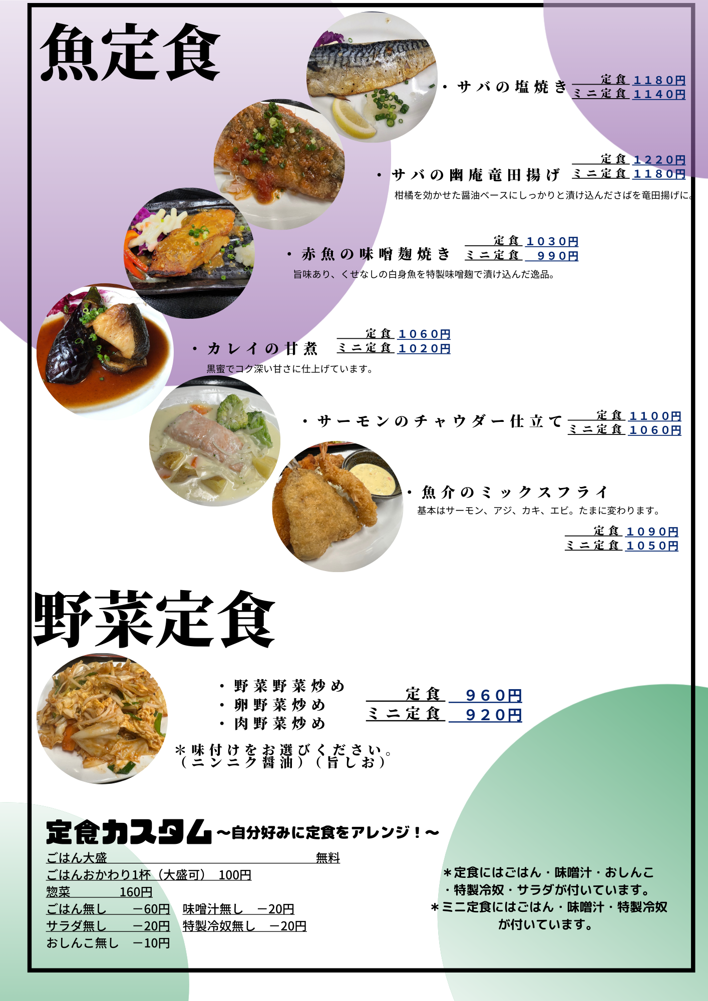 グランドメニュー(昼) 定食お品書き ~TEISYOKU menu~ 当食堂は全てごはんとの相性を第一に考えた「ごはんがススムおかず」となっています!!ぜひ、心ゆくまでごはんを美味しく召し上がってください… *すべての定食にサラダ、おしんこ、みそ汁、特製冷奴が付き、ごはんは大盛無料、+100円でお替り1杯(大盛可)となります。(価格は税込)*-360円でおかずのみ、-60円でごはんなし、に変更可能です。(メニューはこちら) トップページへ